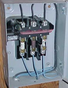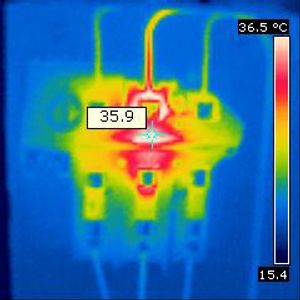 The image above is the infrared scan of a small disconnect switch. The image to the right is a digital picture of the same switch. As you can see the switch "appears" to be fine, with no signs of discolouration. However, when looked at thermo-graphically we can see that the centre phase is considerably hotter than the outside phases (red colour). We can also see clearly that the source of the heat is near the switching mechanism itself. While this particular switch may work for months or years to come, it feeds a motor that would most likely burn up if this switch fails. Changing the switch prior to an eventual failure is more cost-effective.